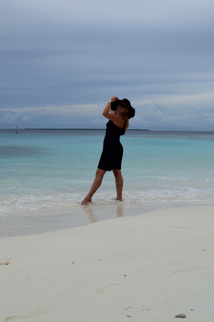 Zu diesem Kleid trage ich meinen schwarzen Sonnenhut, in den ich mich auf den Malediven verliebt habe.